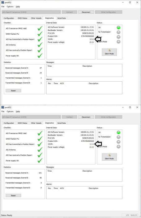 Fortunatamente il 213 é stato sfilato senza troppi patemi d'animo ed ha fatto da testimone per l'Airborne, dato che eravamo in testa d'albero anche l'antenna é stata sostituita. Al termine di tutte le operazioni, abbiamo connesso all'AIS il software di gestione che ci ha dato il risultato dell'operazione: si é passati dall'inziale 2.4:1 ad un eccellente 1.1:1 come si deve dall'immagine allegata.