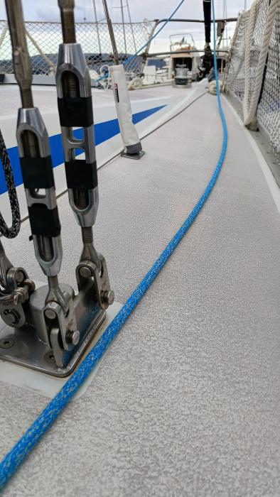 Come da titolo accade che durante le virate la scotta si incastra sotto gli arridatoi delle sartie (vedi foto). Avete soluzioni (a parte manovre di virata accorte per evitare l'incastro) per evitare questo fastidioso problema, anche qualcosa che è possibile autocostuire e avvolgere attorno la landa?