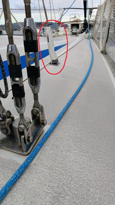 Plastica, inox, sughero.. boh, indifferente, insomma qualcosa che non faccia spostare nuovamente verso l’esterno il perno quando la barca sbanda sottovento e le sartie sbattendo Piccoletto il perno fuori Preferirei un qualcosa di rigido (non cordino, non scotch) perché quest’ultimi assorbono l’acqua e la fanno ristagnare, vabbè son pezzi in inox pieni e non dovrebbero subire la ruggine ma insomma meglio tenere qualcosa di pulito ed asciutto