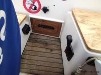 Sul vecchio Sinbad avevo realizzato una cornice in teak alta in modo da coprire con lo sportello chiuso la chiave di avviamento che però qui non c'è. L'ingombro è dettato dalla leva motore, dunque la cornice potrebbe essere di un centimetro. Cornice fissata con viti coperte da tappi in teak, ma puoi utilizzare le stesse viti di fissaggio pannello. La larghezza dipende dai gusti.