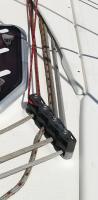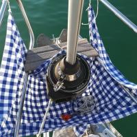Per esempio sono stati inseriti in stampata dettagli come i pianetti per i golfari del bompresso, un notevole paramare con alloggiamento a u sul quale si collega la parte bassa dell capottina,addirittura lo spazio per non schiacciare la chiave se lasciata inserita nella portina del tambuccio dopo l'apertura. Ottimo l'antiscivolo di grana grossa, ricavato in stampata, tiene bene e si pulisce bene, manca pero' sui lati della tuga dove ho sopperito con diversi metri di strisce di antiscivolo adesivo. Il disegno della tuga davanti all'albero lascia spazio ad una zona piana prendisole per due, le drizze sono parzialmente recessate, la tuga è un po' larga e avrei preferito avere carrelli fiocco piu' interni, le panche del pozzetto lunghe abbastanza per stendersi, posizioni comode per timonare, un tavolo centrale non troppo ingombrante tuttofare ( supporto strumentazione, gavoncino e ovviamente tavolo) ,due gavoni ampi, poppa abbattibile con scaletta integrata per comodi bagni. Bimini molto pratico in tre sezioni, con la posteriore da lasciare sempre aperta che non toglie visibilità sulle vele e supporta i pannelli solari. Atrezzatura velica di ottima/discreta qualità ( albero Selden poggiato, doppia crocetta, sartiame interrotto, boma con randa steccata su carrelli Selden con borose a circuito chiuso , lazy bag, Furlex 300s, belin Selden, bompresso Selden, 6 winches Lewmar sul limite del piccolo dimensionalmente. Non male ma non eccelsa il resto dell'attrezzatura Rugertson. Gli stopper sembrano un po' debolucci ma ancora interi dopo 9 anni, quindi tutto sommato vanno. Scotta randa alla tedesca con winches vicini alle ruote .