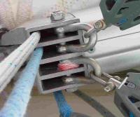 Questa è un'altra a mio parere altrettanto valida e non rovini niente, fai un loop in dynema, attorno al boma, lo fermi a dx e sn con due cavallotti semplici rivettati, solo per non farlo venire avanti e ci appendi i bozzelli dei rinvii .......