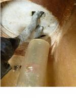 Dalla parte opposta smontando la campana è apparso questo che sembra il residuo di una cuffia (o paraolio?) accroccato con nastro adesivo.