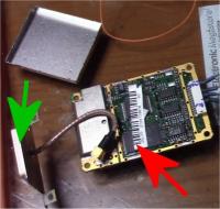 la freccia rossa indica la memoria "incriminata" che essendo a montaggio di superficie e' molto difficile sostituire senza attrezzi adatti, la freccia verde indica la "Patch" antenna. Spiacente, non e' cosa per dilettanti da fare a casa con pochi mezzi.