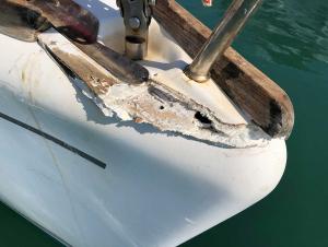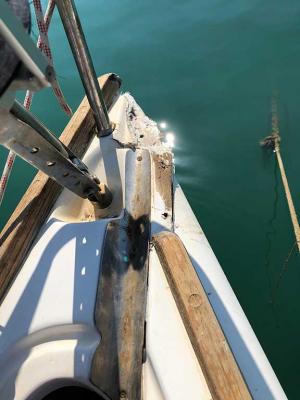 Questa estate, in una giornata di calma piatta, mentre stavo salpando l’ancora per lasciare una rada che si era popolata troppo, si è staccato il musone, per fortuna non è finito in acqua perché trattenuto dal bozzello del gennaker che aveva il circuito montato con la scotta della mura fissata alla bitta di prua. Vi risparmio i dettagli del momento di panico a bordo con moglie, figlie e amiche delle figlie, con l’ancora a mezz’acqua e la barca libera, la cosa che mi è sembrata più sensata da fare per levarmi di mezzo il prima possibile e limitare altri danni, è stata appoggiare la catena sull’estremità della falchetta in teak di dritta e usarla come punto di scorrimento della catena per finire di salpare la catena rimanente e tutto sommato è andata bene. Ho fatto rimontare il musone, una riparazione ovviamente temporanea, giusto per finire le vacanze, rimpiazzati i bulloni e le rondelle, stuccato e via, la mattina dopo ero di nuovo in giro, preoccupatissimo però della tenuta del musone così debole, quindi ad ogni ancoraggio montavo il gancio di ritenuta sulla catena e la cima sulla bitta di prua per scaricarlo completamente. Io sono sicuro di aver controllato bene la tenuta dei bulloni del musone più volte, evidentemente non così bene, ma c’è da notare che il musone del Comet 33 è imbullonato solo con delle rondelle direttamente sulla coperta senza contropiastra all’interno, rendendolo un punto molto debole e infatti si è sradicato da un momento all’altro. Per la riparazione sto facendo fare dei preventivi, mi servirà un buon resinatore che ripristini la zona fratturata della coperta di prua e sto pensando di levare il musone eliminando la sporgenza della sua base e montare una delfiniera Unibow oltre ad acorciare la falchetta in teak di sinistra per adeguarla a quella di dritta. Carico delle foto della zona danneggiata e della riparazione temporanea. Cosa ne pensate? Avete dei suggerimenti?