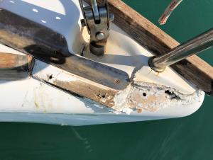 mi pare un montaggio discutibile ad essere buoni. fosse mia rileverei la raggiatura della prua e farei fare una fasciatura in acciaio su cui assicurare il pezzo esistente.