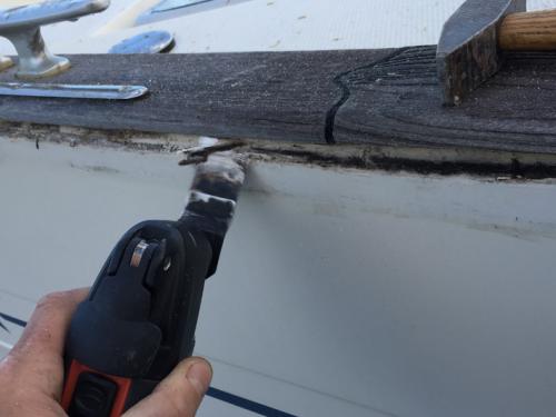 Smontato il belin tutto intorno, con il Fein (seghetto vibrante) ho rimosso tutto il vecchio sigillante sottostante fino a riscoprire tutta la giunta fra scafo e coperta senza però intaccare quest'ultima.