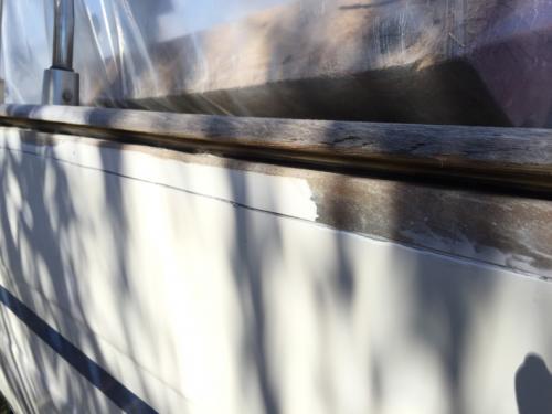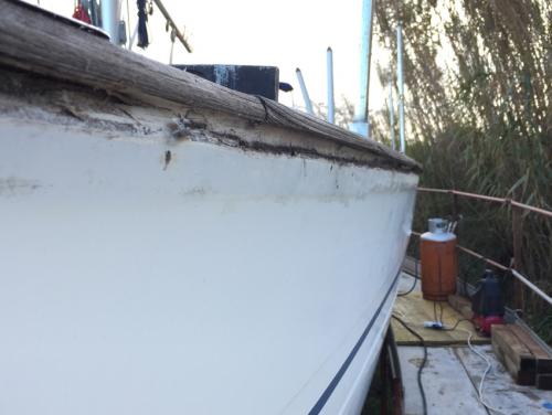 Intervento semplicissimo: smontano il belin in legno che nella mia barca nasconde la giunta scafo/coperta; tolgono e belin il vecchio sigillante esterno fino ad arrivare all'attaccatura scafo/coperta senza però intaccare quest'ultima; rimettono il sigillante in abbondanza ed riavvitano a fresco il belin ed il problema pare risolto.