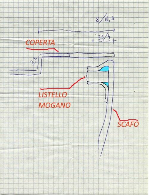 Quello che inizialmente si ipotizzavano delle infiltrazioni nell'attaccatura fra scafo e coperta erano invece infiltrazioni che, entrando da sotto il musone di prua, correvano lungo tutta la barca attraverso i canaletti che la belin ha creato sugli angoli del listello di mogano di rinforzo e non strutturale. Nel disegno a penna riportato nel mio post iniziale, vedendo in sezione paerte di scafo e coperta, i canaletti sono colorati di celeste. Bastava che l'operaio al momento della posa e con il pennello, avesse schiacciato meglio il tessuto della belin del listello di mogano.