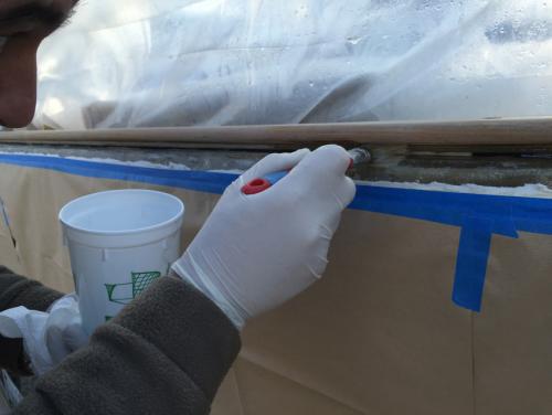A questo punto ed a conferma delle conclusioni a cui eravamo arrivati anche con l'aiuto dei nostri amici, non restava altro che proseguire di buona lena aprendo bene questi canali in più punti; riempierli di epossidica liquida che abbiamo passato a pennello anche su tutte le parti come ancorante; riempire lo spazio fra scafo e coperta dove prima c'era il sigillante con resina epossidica addenzata e caricata con microfribre di spessore misto 3/4/6 mm; rinforzare il tutto con doppio nastro in fibra di vetro e per finire, rimontare il belin esterno.