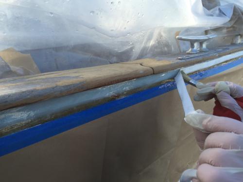 Io, quando mi sono accorto del problema, oltre l’intervento di cui sopra riempiendo i canaletti da vari punti lungo la murata, per avere la massima certezza di un buon risultato, sempre facendo in modo che l’intervento rimanesse poi coperto dal belin, all’altezza del pozzo ancora a prua e su entrambi i lati ho aperto da fuori a dentro due piccole asole per lato (una per il canaletto sopra il listello di mogano ed una per il canaletto sotto interrompendo di fatto e completamente tutti i canali poi, mettendo un pò di stucco da dentro e facendo con del nastro americano delle tasche sopra le fessure, ci ho colato dentro l’epossidica creando di fatto una barriera totale.