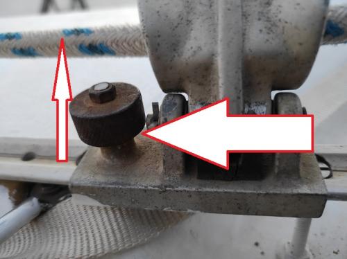 Segare il pistoncino e mettere due paranchini da entrambe le parti, non so che barca sia ma con quel sistema gestire il punto di scotta quando c'è un pò di vento diventa impossibile.