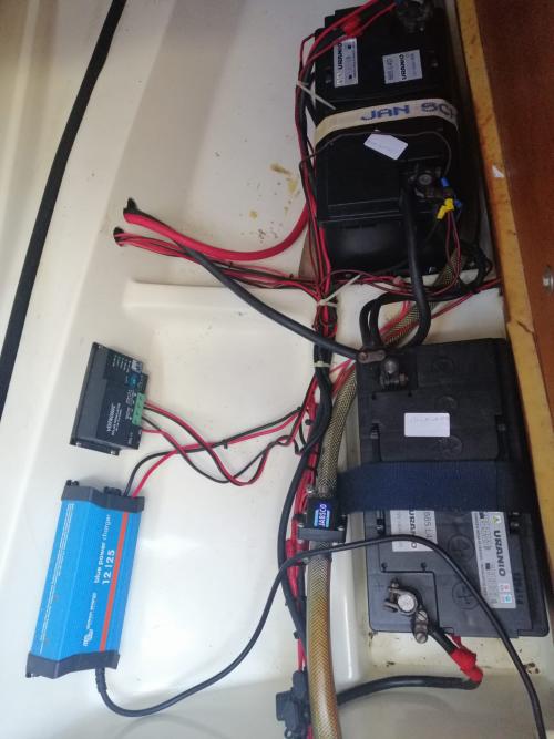 Sono presenti due batterie da 100Ah in parallelo, ben cariche per il momento, un carica batterie, un pannello solare da 100W con il suo controller. Vi è poi uno staccabatterie collegato alla batteria motore ed un deviatore 1-2-Both collegato alla batteria servizi e che funge anche da ponte con la prima.