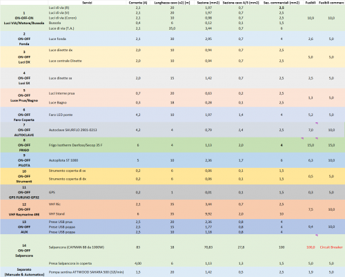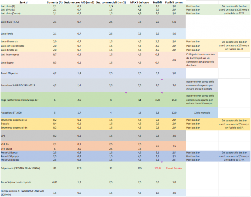 Ho letto molto sulla rete e qui sul forum ed ho comprato il libro di D.Z. per avere un'infarinatura. Ho quindi fatto una ricognizione della barca, piede piede, e tirato giù la tabella utenze - consumi - sezione cavi (sia secondo il metodo più rigoroso tenendo conto anche della distanza e della resistenza del cavo sia con la formula semplificata 3A/mm2) - Fusibili o interruttori di sicurezza.