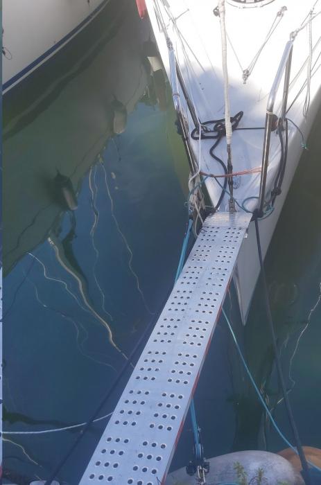 Almeno per l'uso che ne faccio io, la passerella deve essere fatta per poter andare indifferentemente a prua o a poppa. Nella maggior parte dei casi la uso a poppa. Ma mi capita di usarla anche a prua: sicuramente quando la Imarroncinichegalleggiano.... è alta o il fondale è irregolare.
