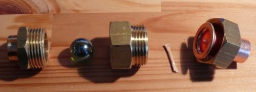 I raccordi sono tutti roba da 1 euro, qui la pallina è pesante perché deve agire in senso opposto, con una pallina galleggiante il principio è lo stesso ma usato in senso opposto: quando la pallina viene spinta a contatto contro la sezione circolare di uno dei raccordi lo tappa.