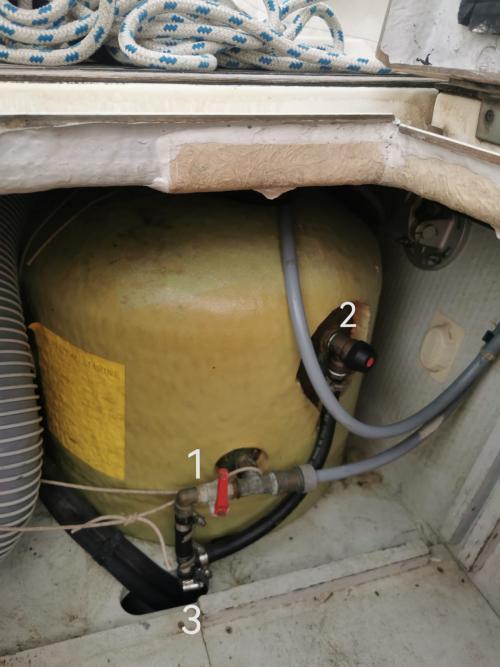 La valvola 2 svitandola sembra come se si aprisse un rubinetto (inizia a correre acqua nel tubo nero 3 che va in sentina) e richiudendo l'acqua smette di defluire. il tubo grigio chiaro vicino alla valvola 1 è il tubo di mandata acqua fredda al boiler mentre il tubo grigio che scende dall'alto è il tubo di uscita acqua calda dal boiler.