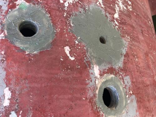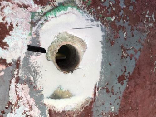 sto cambiando le prese a mare, e ho un paio di dubbi, il foro nello scafo di una di esse, da 1/2 pollice, all'esterno si presenta come da foto, il gelcoat in parte non c'è più e in corrispondenza del passascafo c'è un leggero avvallamento. Ora, il lavoro a regola d'arte sarebbe ridarci il gelcoat e lavorarlo fino ridargli la forma e curvatura corrette, ma non l'ho mai fatto sullo scafo, e il lavoro mi spaventa un pò.