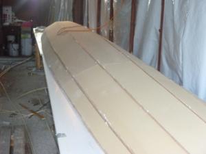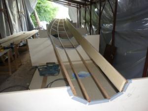 sto realizzando il terzo semicafo laterale , come vedete c'è un listello di cedro tondo per ogni spigolo questo perche il listello ti da subito l'idea dell'avviamento delle linee in quanto il pvc espanso è molto flessibile su lunghezze di 9 metri .Ma soprattutto ti evita di lavorare i fianchi del corso di fasciame per accoppiarli uno con l'altro (quartabono)